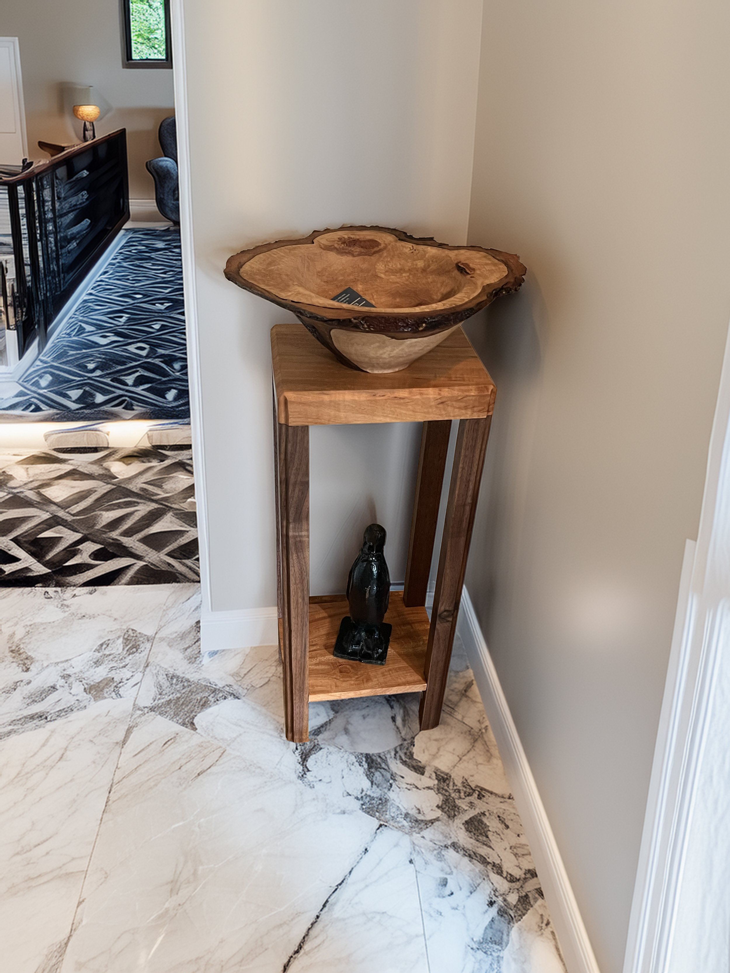 This gifted table and the pecan burl bowl resting on top, both came from the same tree. I built the table while a brother in Christ, working from afar, turned the burl into a bowl. Distance required coordination and trust, and the finished piece reflects a shared beginning between two makers connected by faith and purpose. Below the image showcase is a video of the bowl being made.